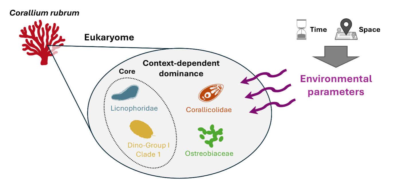 Figure 2 : Schéma récapitulatif. Cette étude démontre que l'eucaryome du corail méditerranéen Corallium rubrum présente une grande variabilité et que la dominance de certains taxons est influencée par des facteurs environnementaux spatio-temporels. Malgré cela, certaines familles microeucaryotes, telles que les Licnophoridae et le clade 1 du groupe Dino I, sont systématiquement présentes, ce qui suggère qu'elles jouent un rôle clé dans l'holobionte du corail. Crédit : Prioux et al, 2025.